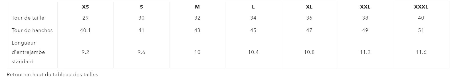 | Taille | S – 30, M – 32, L – 34, XL – 36, XXL – 38 |