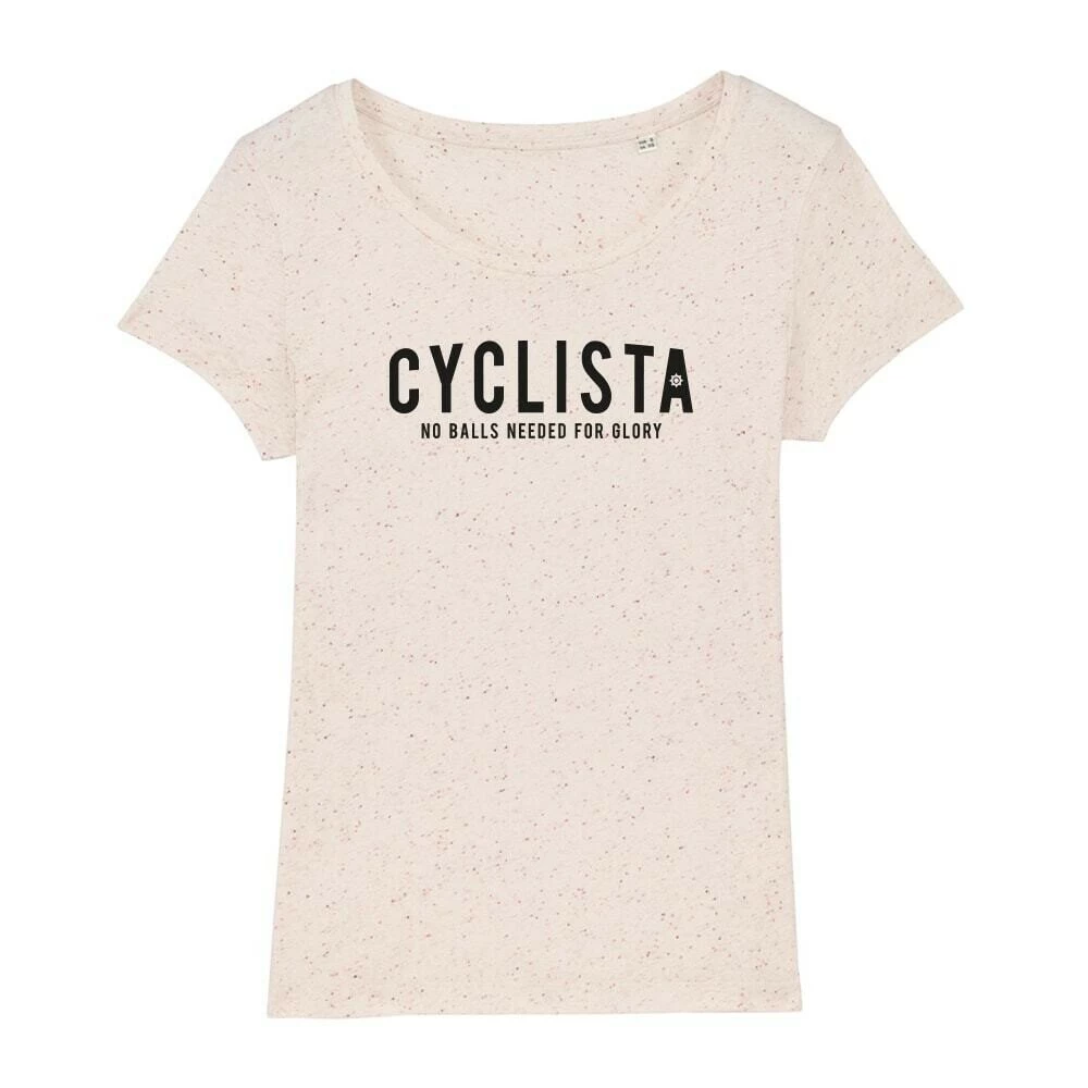 Pour les amatrices de cyclisme, ou cyclistas comme on les a baptisées, nous avons réalisé ce t-shirt élégant avec ce message « no balls needed for glory ».